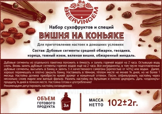 дубовые сегменты средней обжарки, гвоздика, корица, темный изюм, вяленая вишня, обжаренный миндаль.