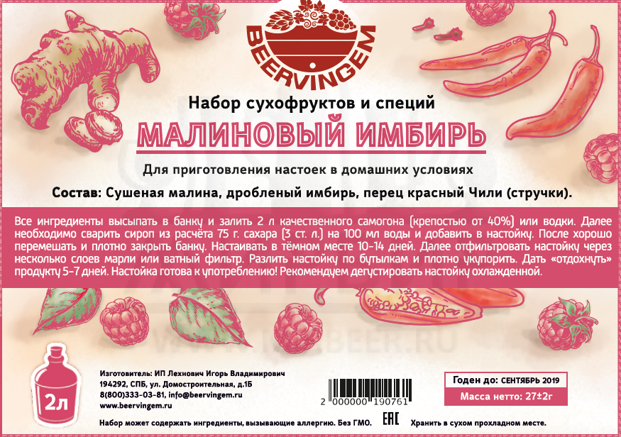 Состав: Сушеная малина, дробленый имбирь, перец красный Чили (стручки). Рецепт: