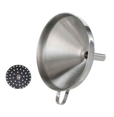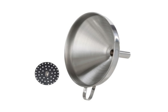 Применяется розлива и/или перелива продукта в емкости, выполнена из нержавеющей стали AISI 304. Воронка может комплектоваться фильтром, продается отдельно. Фильтр устанавливается на дно воронки и предотвращает попадание крупных включений в наполняемый сосуд, таких как ягоды, дубовая щепа и т.п.