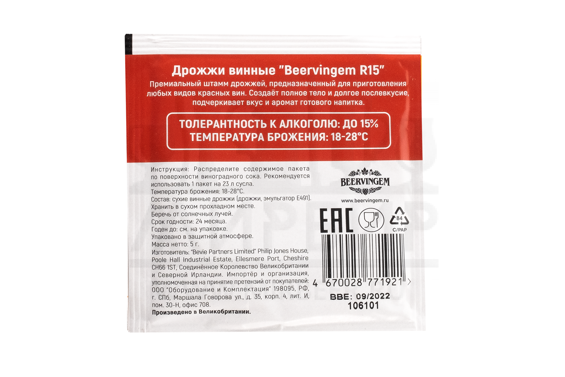 - Вид дрожжей: Saccharomyces cerevisiae